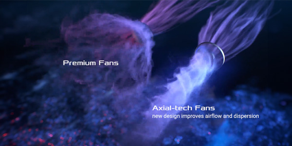 Với hai quạt công nghệ Axial đã được thử nghiệm và thực sự có một trung tâm nhỏ hơn tạo điều kiện cho các cánh quạt dài hơn và một vòng chắn để tăng áp suất không khí đi xuống.