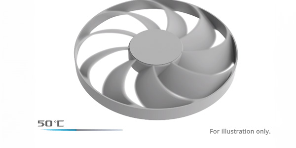 Bố cục tấm che, tản nhiệt và ống dẫn nhiệt được thiết kế cẩn thận cho phép hai quạt công nghệ Axial tận dụng hệ thống thông gió ở mặt bên khung máy và mang lại hiệu suất nhiệt phù hợp với kích thước của card.