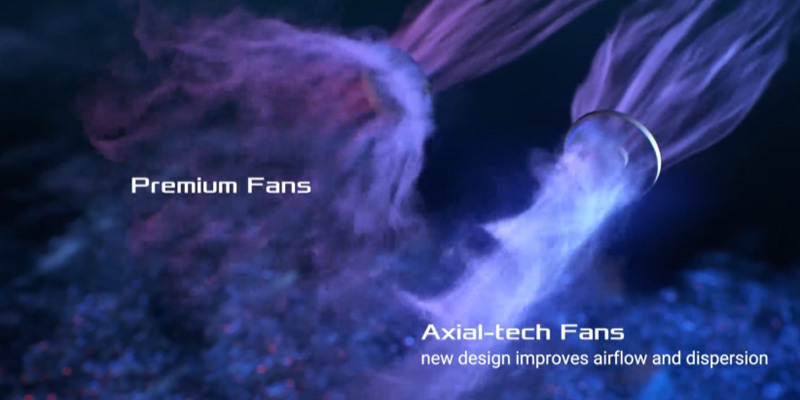 Hai quạt công nghệ Axial đã được thử nghiệm và thực sự có một trung tâm nhỏ hơn tạo điều kiện cho các cánh quạt dài hơn và một vòng chắn để tăng áp suất không khí đi xuống.