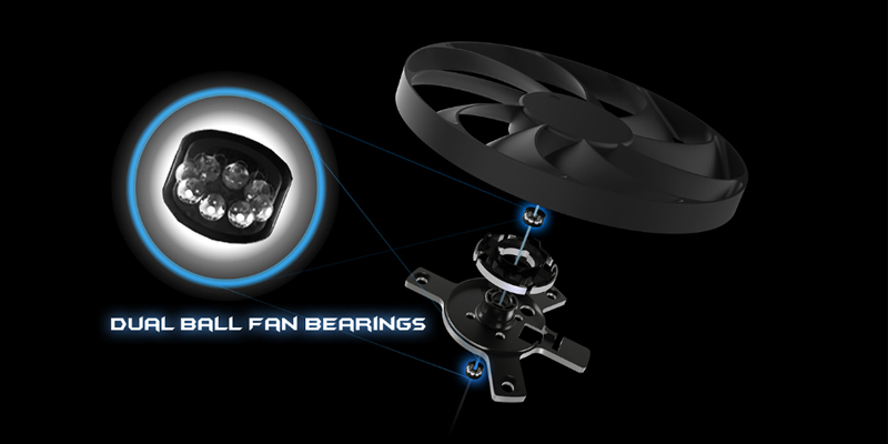 Dual Ball Fan Bearings bao gồm hai bi bạc được đặt lồng vào nhau - một bi nằm trong và một bi nằm ngoài. Bi nằm ngoài được đặt trong vòng bi độc lập, trong khi bi bên trong tiếp xúc trực tiếp với trục quạt. Khi quạt hoạt động, bi bên trong xoay cùng với trục và giúp giảm ma sát và độ mài mòn, từ đó giúp tăng tuổi thọ cao hơn.