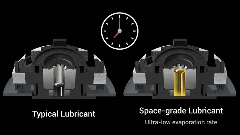 Cải thiện chất lượng Sử dụng dầu nhớt bôi trơn bền thường được tìm thấy trong các ứng dụng hàng không vũ trụ, mang lại âm thanh êm ái hơn so với các thiết kế ổ bi kép và phù hợp với độ bền của chúng. |