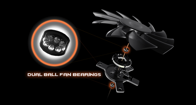 Fan công nghệ Axial Được thiết kế với công nghệ mới cho thế hệ card đồ họa, Fan giúp tạo điều kiện cho các cánh quạt để có một vòng chắn giúp tăng áp suất không khí đi xuống. |