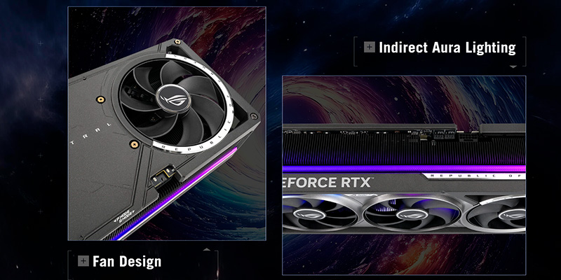 Card sở hữu phong cách thiết kế mạnh mẽ mang dấu ấn ROG Astral, với hệ thống ARGB AURA Sync cho phép đồng bộ ánh sáng toàn hệ thống. Kích thước 357.6 x 149.3 x 76 mm với thiết kế chiếm 3.8 slot khiến card trở thành tâm điểm nổi bật trong mọi bộ máy PC. Đi kèm là bộ phụ kiện cao cấp gồm ROG Graphics Card Holder, ROG Keycap, ROG PCB Ruler cùng nhiều vật phẩm độc quyền, gia tăng tính sưu tầm và đẳng cấp cho game thủ.