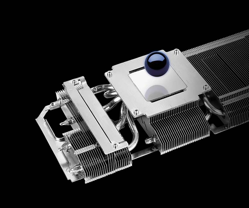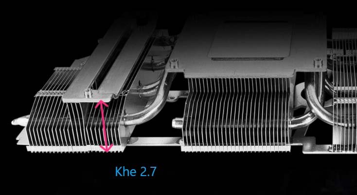 Khe cắm 2.7 Bộ tản nhiệt sẽ dẫn nhiệt vào các ống dẫn nhiệt và tản nhiệt sau đó tiếp tục đi qua một loạt lá tản nhiệt xếp dạng vây, lấp đầy hầu hết diện tích khe cắm 2.7 của card. |
