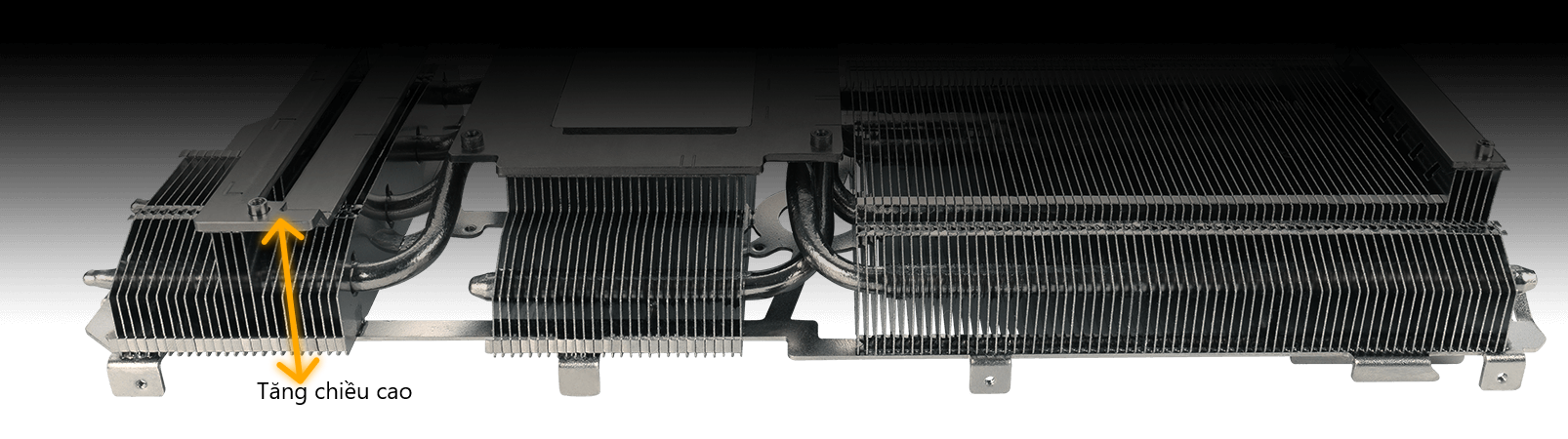 Khe cắm 2.7 Bộ tản nhiệt hút nhiệt vào các ống dẫn nhiệt đưa nó qua một ngăn xếp dạng vây, lấp đầy hầu hết diện tích khe cắm 2.7 |