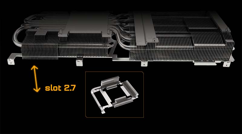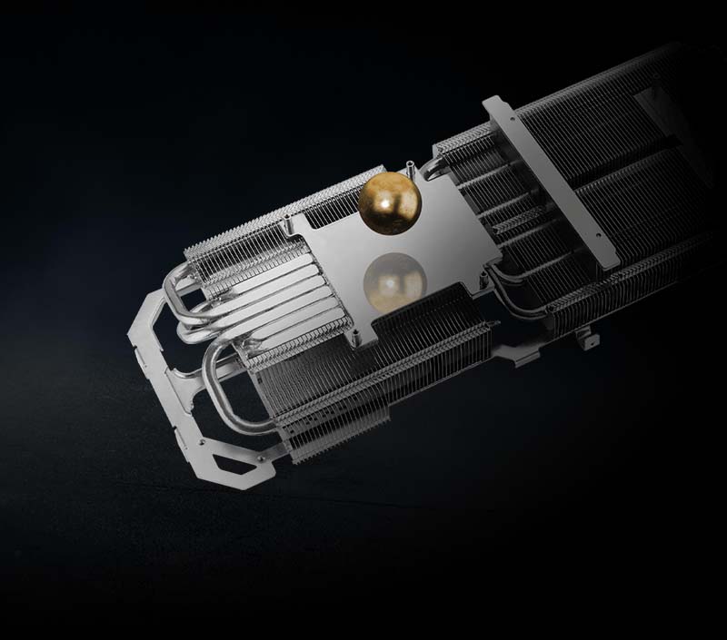 Slot 2.7 Bộ tản nhiệt sẽ dẫn nhiệt vào các ống dẫn nhiệt và tản nhiệt sau đó tiếp tục đi qua một loạt lá tản nhiệt xếp dạng vây, lấp đầy hầu hết diện tích Slot 2.7 của VGA TUF Gaming GeForce RTX 3090. |
