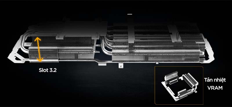Slot 3.2 Bộ tản nhiệt sẽ dẫn nhiệt vào các ống dẫn nhiệt và tản nhiệt sau đó tiếp tục đi qua một loạt lá tản nhiệt xếp dạng vây, lấp đầy hầu hết diện tích Slot 3.2 của VGA TUF Gaming GeForce RTX 3090 Ti OC Edition. |