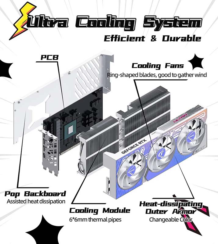 Hệ thống tản nhiệt VGA Colorful iGame GeForce RTX 4070 Ultra W OC V2-V trang bị 6 ống dẫn nhiệt 6mm và backboard tản nhiệt hỗ trợ điều tiết nhiệt độ cho card đồ họa luôn mát để thể hiện hiệu năng ở mức tốt nhất. |