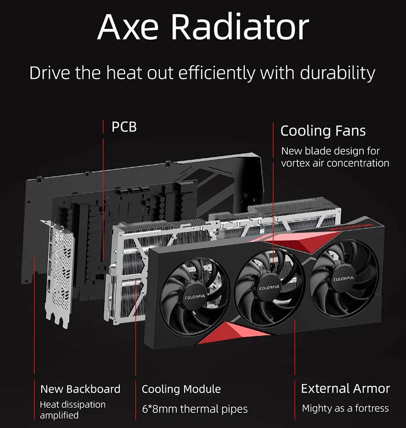 Bộ tản nhiệt đỉnh cao VGA Colorful iGame GeForce RTX 4080 NB EX-V thiết kế fan tản nhiệt với cánh quạt mới tạo ra nồng độ không khí xoáy tốt hơn để tạo khả năng tản nhiệt tốt hơn. Radiator với 6 ống dẫn nhiệt 8mm cùng backboard hỗ trợ khuếch đại khả năng tản nhiệt của VGA. |