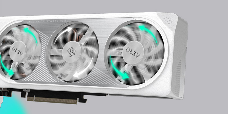 Hệ thống tản nhiệt WINDFORCE trang bị 3 fan 80mm, quay luân phiên cùng 4 ống dẫn nhiệt bằng đồng tổng hợp để GPU tiếp xúc trực tiếp giúp mang lại khả năng tản nhiệt hiệu quả cao.