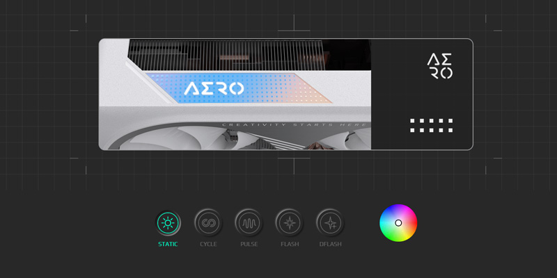VGA Gigabyte GeForce RTX 4060 Ti AERO OC 16G GDDR6 với các tùy chọn màu sắc có thể tùy chỉnh 16,7M và nhiều hiệu ứng ánh sáng, bạn có thể chọn các hiệu ứng ánh sáng hoặc đồng bộ hóa với các thiết bị Gigabyte khác.