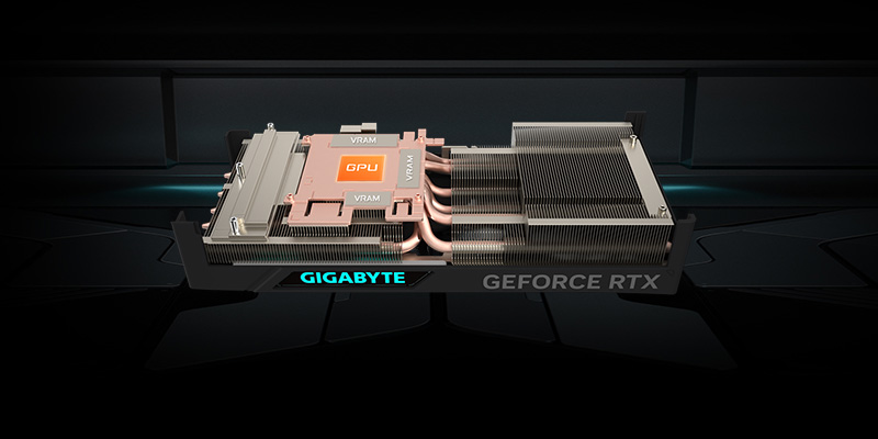 Tấm đồng lớn tiếp xúc trực tiếp với GPU, kết hợp với các ống dẫn nhiệt composite giúp truyền nhiệt nhanh chóng của GPU và VRAM tới tản nhiệt.