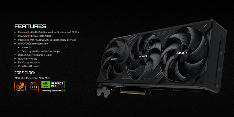 VGA Gigabyte GeForce RTX 5070 Ti WINDFORCE OC SFF 16GB GDDR7 sử dụng GPU GeForce RTX™ 5070 Ti thế hệ mới với xung nhịp 2497 MHz (cao hơn mức tham chiếu 2452 MHz) cùng 8960 CUDA Cores. Với kiến trúc NVIDIA Blackwell, card mang lại khả năng xử lý đồ họa mạnh mẽ, hỗ trợ mượt mà từ gaming AAA ở độ phân giải cao cho đến các tác vụ render, thiết kế đồ họa và ứng dụng AI. Phiên bản OC (Overclocked) đảm bảo hiệu năng vượt trội so với bản chuẩn, phục vụ tốt cho cả game thủ chuyên nghiệp và nhà sáng tạo nội dung.