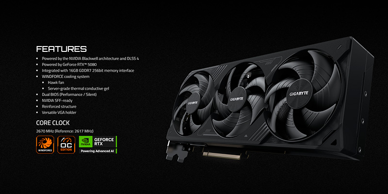 VGA Gigabyte GeForce RTX 5080 WINDFORCE OC SFF 16GB GDDR7 được trang bị GPU NVIDIA RTX 5080 dựa trên kiến trúc Blackwell tiên tiến, cung cấp 10.752 nhân CUDA và bộ nhớ GDDR7 16GB với giao diện 256-bit. Với xung nhịp cơ bản 2.295 MHz và xung nhịp tăng cường lên đến 2.670 MHz, card đồ họa này mang lại hiệu suất vượt trội cho cả gaming và các ứng dụng đồ họa chuyên nghiệp.