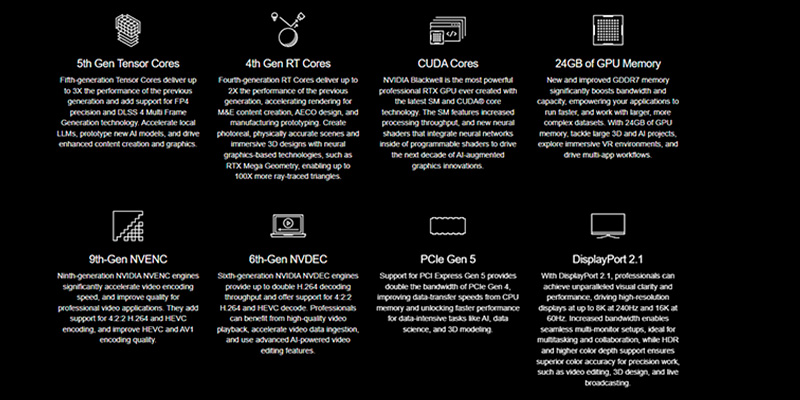 Card đồ họa máy trạm VGA Leadtek NVIDIA QUADRO RTX PRO 4000 Blackwell 24GB GDDR7 đánh dấu một bước nhảy vọt về hiệu suất nhờ được xây dựng trên nền tảng kiến trúc NVIDIA Blackwell thế hệ mới nhất. Sở hữu tới 8960 nhân CUDA, cỗ máy này mang lại khả năng tính toán đồ họa và xử lý song song ở đẳng cấp hoàn toàn khác biệt. Đặc biệt, với sự hỗ trợ của các nhân Tensor thế hệ mới, card cung cấp sức mạnh trí tuệ nhân tạo (AI) tổng thể lên tới 1247 TOPS, giúp tăng tốc triệt để các tác vụ deep learning, render 3D theo thời gian thực và các phần mềm ứng dụng AI tạo sinh phức tạp nhất của giới sáng tạo chuyên nghiệp.