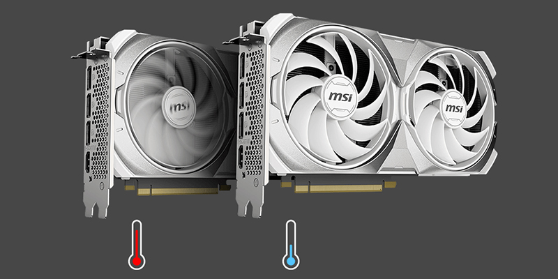 Cánh quạt VGA MSI GeForce RTX 4070 VENTUS 2X WHITE 12G OC hoàn toàn dừng khi nhiệt độ ở mức tương đối thấp, loại bỏ tất cả tiếng ồn khi không cần thiết và sẽ tự hoạt động trở lại khi nhiệt độ tăng cao.