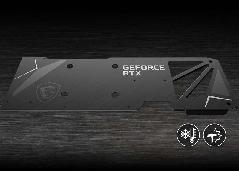 Tấm Plate nhôm VGA MSI GeForce RTX 4080 VENTUS 3X 16GB OC sử dụng tấm backplate bằng nhôm chắc chắn để bảo vệ card đồ họa, đồng thời tăng khả năng tản nhiệt cho linh kiện bên trong. |