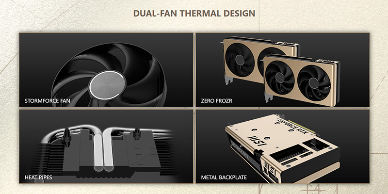 Hệ thống tản nhiệt của MSI GeForce RTX 5060 INSPIRE 2X OC được thiết kế với 2 quạt làm mát lớn hoạt động theo công nghệ Zero Frozr – tự động ngắt quạt khi tải nhẹ và quay trở lại khi hệ thống cần làm mát. Kết hợp với tấm backplate kim loại chắc chắn, card luôn duy trì nhiệt độ lý tưởng khi hoạt động ở hiệu suất cao. Thiết kế tản nhiệt này không chỉ đảm bảo tuổi thọ lâu dài cho linh kiện mà còn giảm tối đa tiếng ồn, phù hợp với môi trường làm việc yên tĩnh hoặc phòng stream chuyên nghiệp.