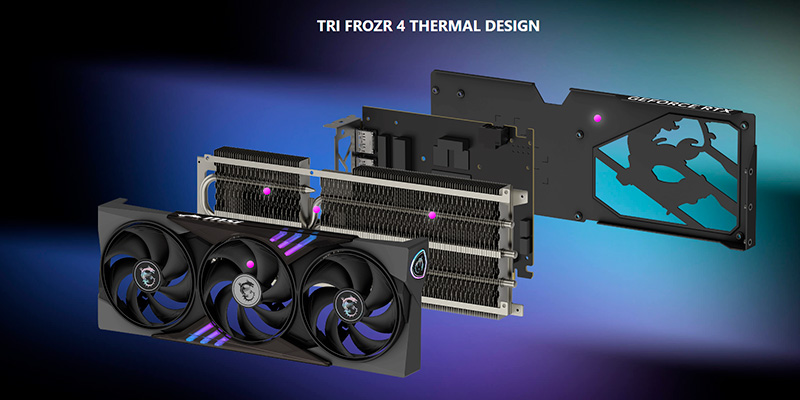 Card đồ họa trang bị tản nhiệt TRI FROZR 4 nổi tiếng với ba quạt STORMFORCE thiết kế 7 cánh quạt dạng claw-texture giúp tối ưu luồng gió, đế đồng mạ nickel và Core Pipes với diện tích tiếp xúc GPU lớn hơn, hỗ trợ truyền dẫn nhiệt hiệu quả hơn. Kết hợp cùng Wave Curved 4.0 và Air Antegrade Fin 2.0, hệ thống tản nhiệt này đảm bảo card luôn duy trì hiệu năng ổn định kể cả trong các tác vụ đồ họa nặng liên tục.