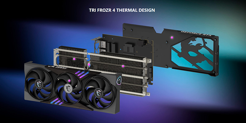Công nghệ tản nhiệt độc quyền TRI FROZR 4 trên phiên bản GAMING TRIO được nâng cấp toàn diện với STORMFORCE Fan sử dụng 7 cánh quạt có bề mặt vân móng vuốt tạo luồng gió ổn định và êm ái. Baseplate đồng mạ nickel, hệ thống Core Pipes thiết kế vuông tiếp xúc tối đa, và Wave Curved 4.0 giúp luồng khí đi sâu vào toàn bộ heatsink. Ngoài ra, Air Antegrade Fin 2.0 tối ưu tốc độ luồng khí tại điểm thoát, giúp card luôn mát mẻ kể cả khi chơi game AAA hay render 3D nặng. Kết hợp với lớp thermal pad cao cấp, toàn bộ hệ thống hoạt động êm ái, ổn định và kéo dài tuổi thọ linh kiện.