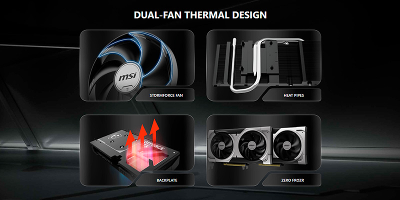 MSI trang bị 2 quạt TORX FAN 4.0 trên hệ thống làm mát giúp tăng áp suất gió và dẫn nhiệt nhanh ra khỏi khu vực GPU. Thiết kế backplate kim loại cứng cáp giúp bảo vệ bo mạch và hỗ trợ tản nhiệt thụ động. Dù hoạt động liên tục ở hiệu suất cao, card vẫn duy trì nhiệt độ ổn định, phù hợp cho các phiên chơi game dài.