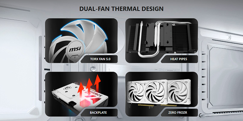 MSI trang bị cho phiên bản VENTUS 2X OC WHITE hệ thống tản nhiệt TORX Fan 5.0 gồm hai quạt làm mát thông minh, thiết kế cánh quạt xen kẽ nâng cao áp suất gió tập trung vào heatsink, đảm bảo nhiệt độ luôn được kiểm soát tốt. Ngoài ra, công nghệ Zero Frozr cho phép quạt tạm dừng khi tải nhẹ, giúp card vận hành êm ái trong môi trường làm việc yên tĩnh. Với kích thước gọn và giải pháp tản nhiệt hiệu quả, người dùng không cần quá lo lắng khi lắp card vào các case mini hoặc tầm trung.