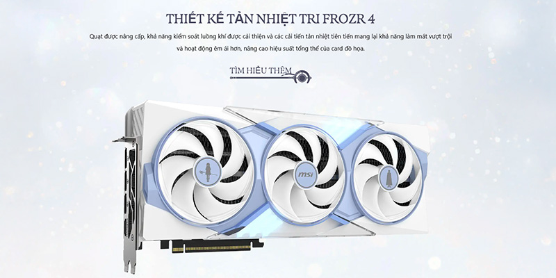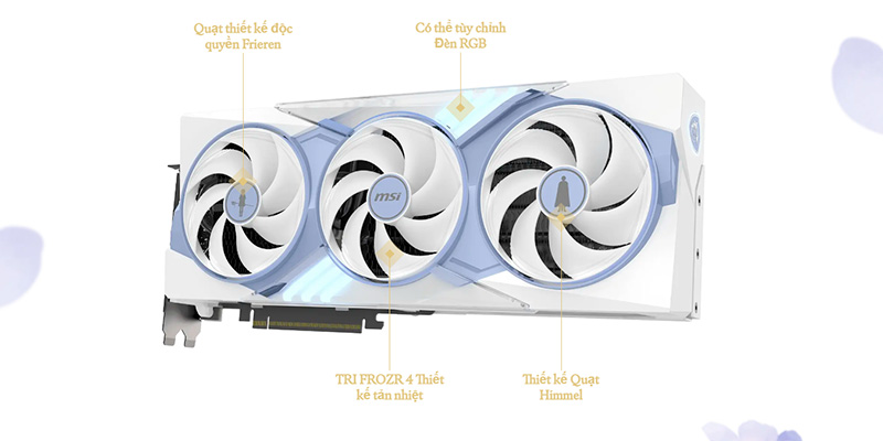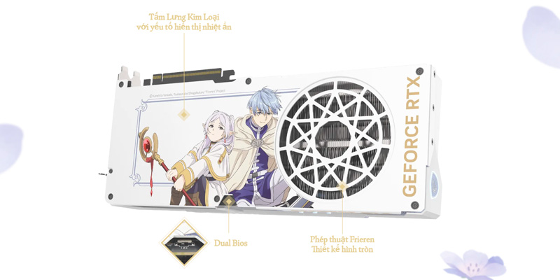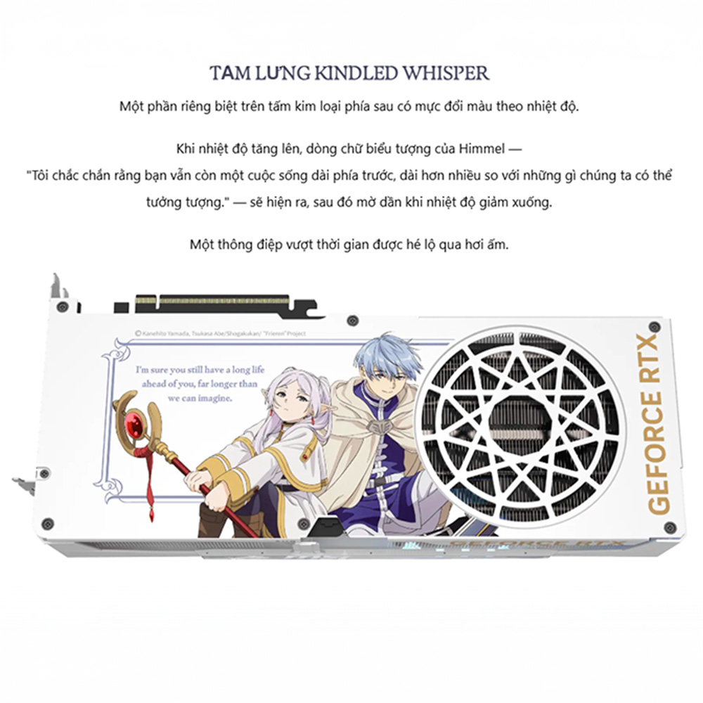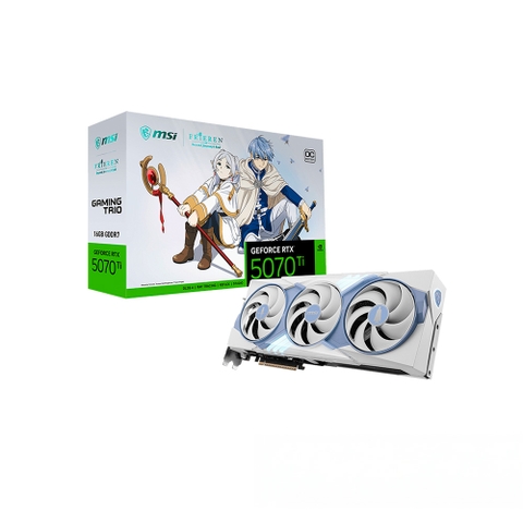 VGA MSI GeForce RTX 5070 Ti 16G FRIEREN EDITION OC 16GB GDDR7 là kết quả của màn hợp tác đầy nghệ thuật giữa MSI và thương hiệu Anime/Manga đình đám Frieren: Beyond Journey's End (hay tựa tiếng việt là Pháp Sư Tiễn Táng). Chiếc VGA này khoác lên mình lớp áo trắng đặc trưng của bộ Anime/Mang mang đến cảm giác rất nhẹ nhàng và sang trọng. Chiếc card đồ họa này chắc chắn là món đồ sưu tầm vô giá cho góc PC của các fan hâm mộ anime. Đặc biệt, hệ thống tản nhiệt được tối ưu hóa cực kỳ xuất sắc giúp card giữ được độ dày lý tưởng chỉ 2.5 Slot cùng kích thước tổng thể 338 x 140 x 50 mm, vừa vặn với nhiều không gian thùng máy từ tiêu chuẩn đến cao cấp.