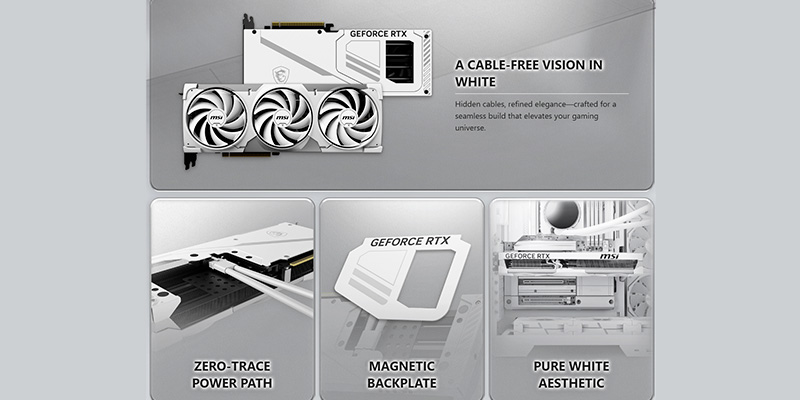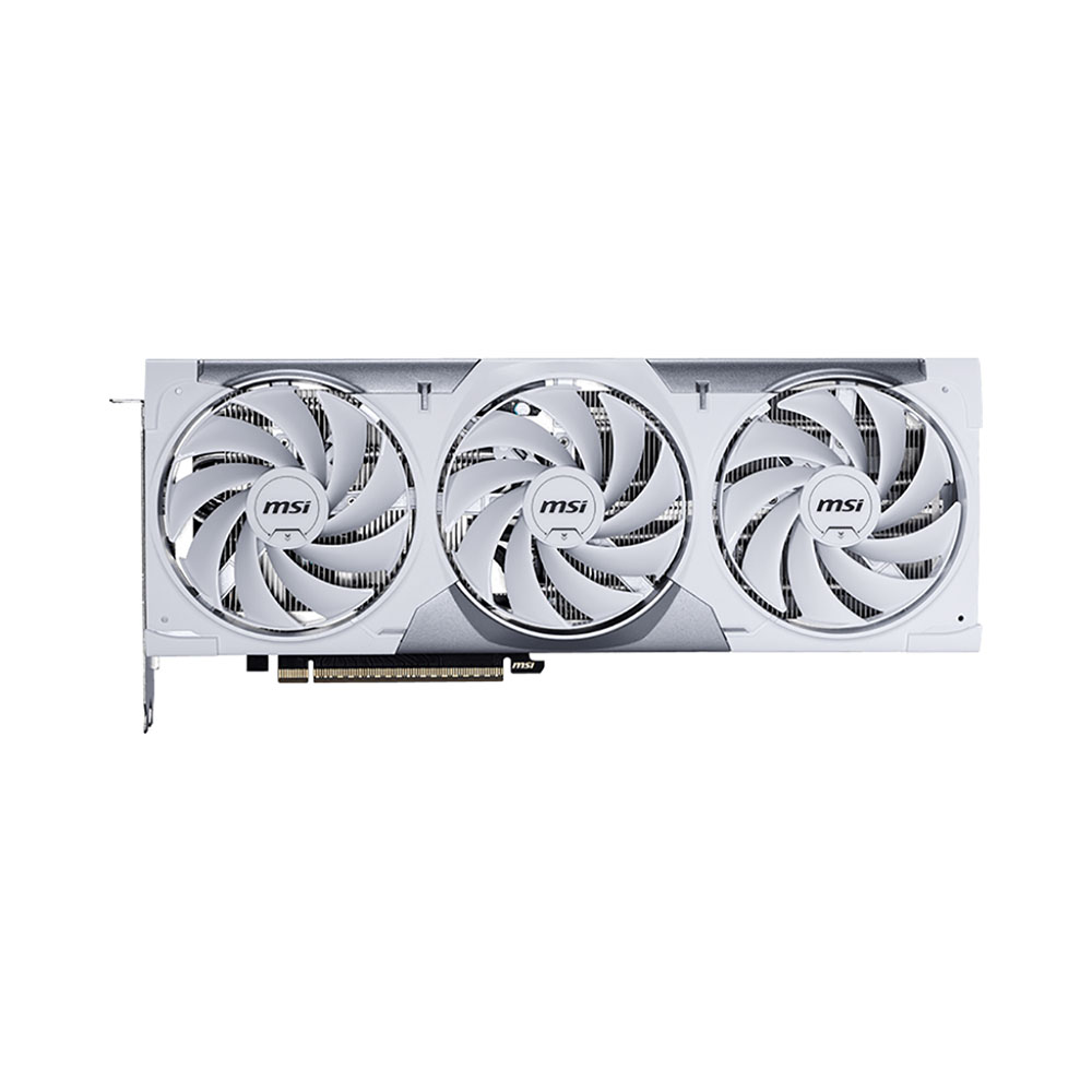 MSI đã mang đến một cuộc cách mạng về thẩm mỹ với thiết kế PZ (Project Zero), hướng tới những bộ máy tính có khả năng giấu dây hoàn hảo. Các đầu nối nguồn được bố trí khéo léo để hỗ trợ các bo mạch chủ và vỏ case chuyên dụng, giúp loại bỏ sự lộn xộn của dây cáp ở mặt trước, tạo nên một không gian nội thất PC gọn gàng và sạch sẽ chưa từng có. Song hành với vẻ đẹp đó là hệ thống tản nhiệt VENTUS 3X trứ danh với ba quạt làm mát hiệu suất cao, đảm bảo luồng khí lưu thông liên tục qua các lá nhôm tản nhiệt dày đặc. Với kích thước tổng thể 303 x 121 x 49 mm, card đồ họa này cân bằng tốt giữa hiệu năng tản nhiệt và khả năng tương thích với các vỏ case mid-tower phổ biến, đồng thời trọng lượng 1077g cho thấy sự chắc chắn trong chất lượng build mà không gây quá nhiều áp lực lên khe PCIe.