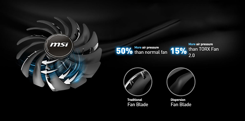 Fan TORX 3.0 VGA MSI Radeon RX 6650 XT MECH 2X 8G OC sử dụng Fan TORX 3.0 với hiểu quả được cải tiến giúp cánh quạt tập trung được luồng không khí vào hệ thống làm mát. |