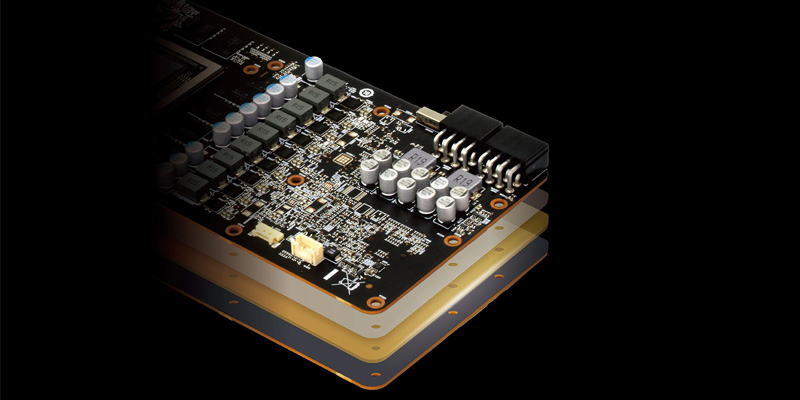 Bảng mạch PCB TG cao 14 lớp cao cấp trên Red Devil RX 7800 XT bao gồm 2 lớp nguồn oz. PCB được thiết kế như vậy giúp giảm hiện tượng mất tín hiệu trong quá trình truyền: đặc biệt quan trọng đối với các GPU cao cấp hơn với nhu cầu ngày càng tăng về dòng điện cao hơn và độ ổn định.