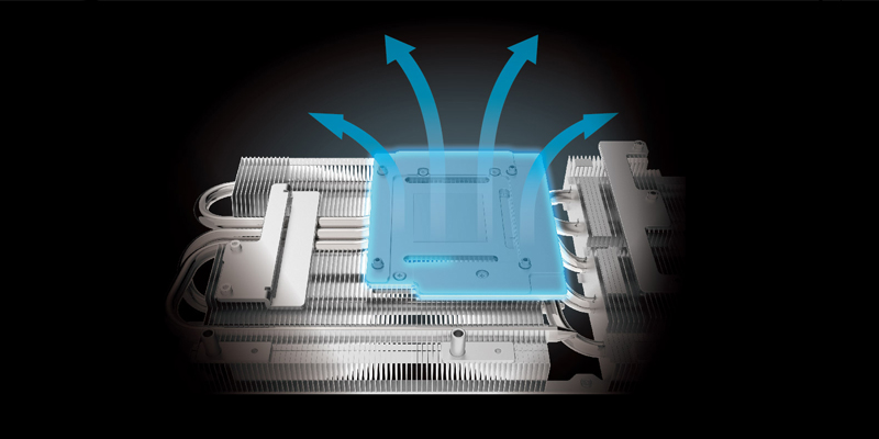 VGA PowerColor Radeon Hellhound RX 7800 XT đã cải thiện phần diện tích tấm đồng để tiếp xúc trực tiếp với GPU lớn hơn đồng thời bao phủ VRAM nhằm tăng ngưỡng truyền nhiệt lên mức tối đa.