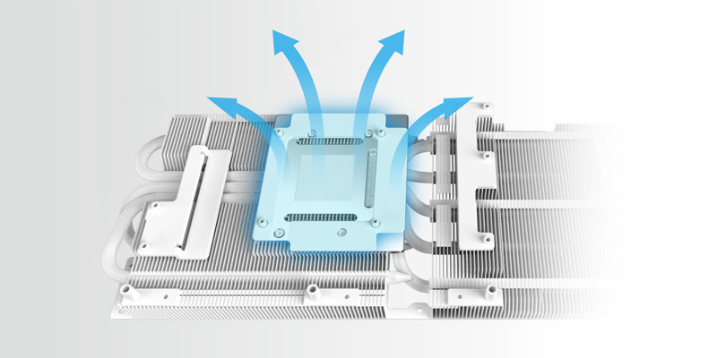 VGA PowerColor Radeon Hellhound Spectral White RX 7800 XT đã cải thiện phần diện tích tấm đồng để tiếp xúc trực tiếp với GPU lớn hơn đồng thời bao phủ VRAM nhằm tăng ngưỡng truyền nhiệt lên mức tối đa.