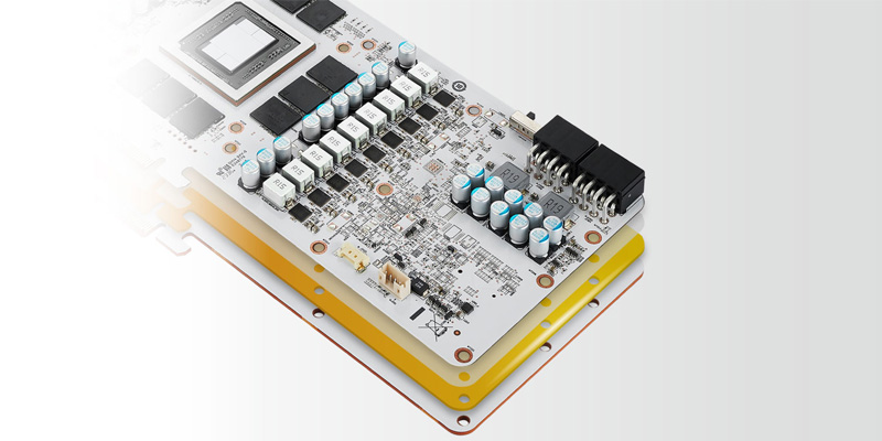 Bảng mạch PCB TG cao 14 lớp cao cấp trên Red Devil RX 7800 XT bao gồm 2 lớp nguồn oz. PCB được thiết kế như vậy giúp giảm hiện tượng mất tín hiệu trong quá trình truyền: đặc biệt quan trọng đối với các GPU cao cấp hơn với nhu cầu ngày càng tăng về dòng điện cao hơn và độ ổn định.
