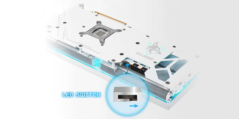 VGA PowerColor Radeon Hellhound Spectral White RX 7800 XT với đèn hai tùy chọn màu đèn LED: Ice Blue và Glacier White, người dùng có thể chọn màu mình muốn bằng cách gạt công tắc ở bên cạnh card.
