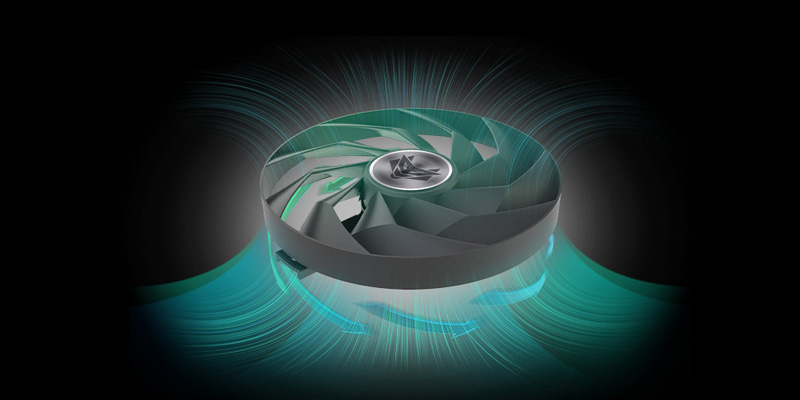 Cánh quạt trên VGA Sapphire NITRO+ Radeon RX 7900 GRE Gaming OC 16G GDDR6 cung cấp hai lớp áp suất không khí đi xuống, cùng với áp suất không khí ở vòng ngoài của quạt hướng trục, dẫn đến áp suất không khí đi xuống nhiều hơn tới 44% và luồng không khí nhiều hơn tới 19% để vận hành êm hơn và mát hơn khi so sánh với các thế hệ trước.