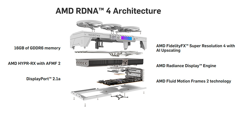 Card đồ họa hỗ trợ nhiều công nghệ hình ảnh mới như AMD FidelityFX™ Super Resolution 4 (FSR 4) với AI Upscaling, AMD Fluid Motion Frames 2, và Radeon™ Anti-Lag 2, mang đến trải nghiệm mượt mà, hình ảnh sắc nét và giảm độ trễ khi chơi game. Tính năng Ray Tracing thế hệ 3 tái hiện ánh sáng và bóng đổ cực kỳ chân thực, đưa game thủ đến gần hơn với thế giới ảo sống động. Hỗ trợ HDMI 2.1 và DisplayPort 2.1a cho phép xuất hình ảnh đến 4 màn hình độ phân giải 8K, tần số quét cao, lý tưởng cho cả gaming lẫn công việc đồ họa chuyên nghiệp.