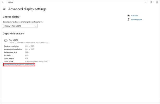 - Bước 2: Bạn cuộn xuống dưới và chọn vào Advanced display settings. Tiếp đêna chọn tiếp vào Display adapter properties for Display 1.