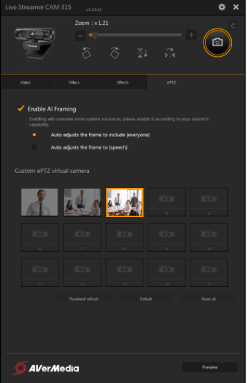 Tính năng chuyên nghiệp Phần mềm CamEngine cung cấp tính năng nổi bật như AI Framing, khung hình được hỗ trợ bởi AI giúp lấy được khung hình hoàn hảo với mọi người tham gia và tự động phóng to với bất kỳ ai phát biểu. Ngoài ra tính năng khử tiếng ồn do AI hỗ trợ xác định và loại bỏ bất kỳ âm thanh xung quanh nào có thể cản trở cuộc giao tiếp. |