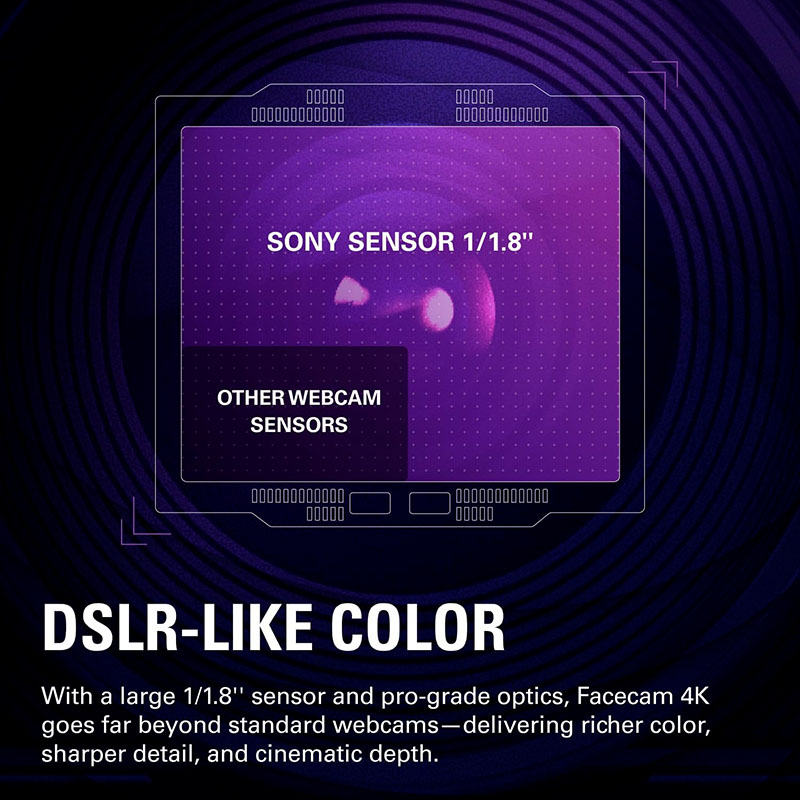 Webcam máy tính Elgato Facecam 4K 10WAF9901 được trang bị cảm biến Sony® STARVIS 2 CMOS 1/1.8", mang lại khả năng ghi hình vượt trội với chi tiết sắc nét, độ sáng tối ưu và màu sắc trung thực ngay cả trong điều kiện thiếu sáng. Đây là cảm biến cao cấp thường được sử dụng trong các thiết bị quay chuyên nghiệp, giúp hình ảnh đạt chuẩn HDR với độ tương phản cao, làm nổi bật từng chi tiết khuôn mặt. Với công nghệ xử lý hình ảnh tiên tiến, Facecam 4K mang đến trải nghiệm quay video mượt mà, rực rỡ và sống động trong mọi khung hình.