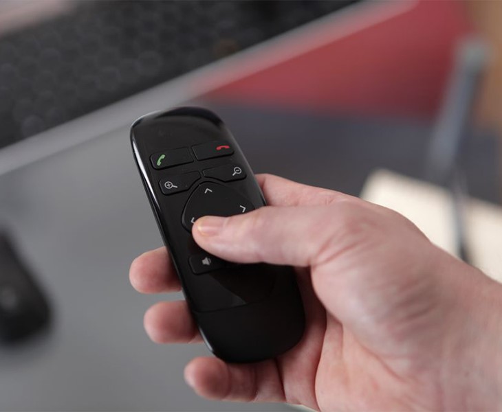 | Điều khiển từ xa Điều khiển camera và âm thanh của BCC950 trên thiết bị thu với điều khiển cầm tay từ xa. Theo cách nào đi nữa, thật dễ dàng với tới nút tắt tiếng quan trọng. |  |