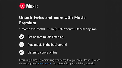 Bên cạnh chính sách mới về lời bài hát, YouTube Music tính phí bằng cách duy trì các giới hạn trải nghiệm đã tồn tại từ trước đối với tài khoản miễn phí, bao gồm: