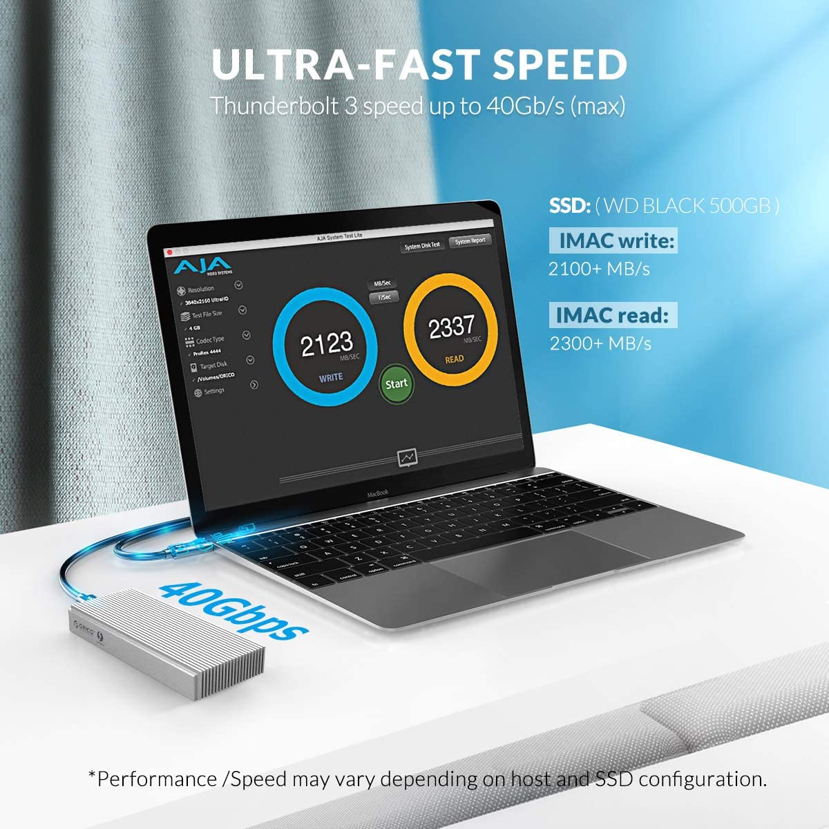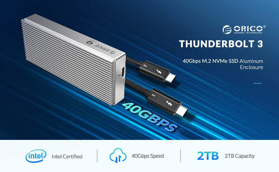 Tốc độ cực nhanh Box SSD M.2 PCIe NVMe to Thunderbolt 3 Type-C Orico SCM2T3-G40 Aluminum có thể đạt mức hiệu suất không thể tin được với băng thông cực khủng 40Gbps của Thunderbolt 3, và cũng hỗ trợ UASP. |